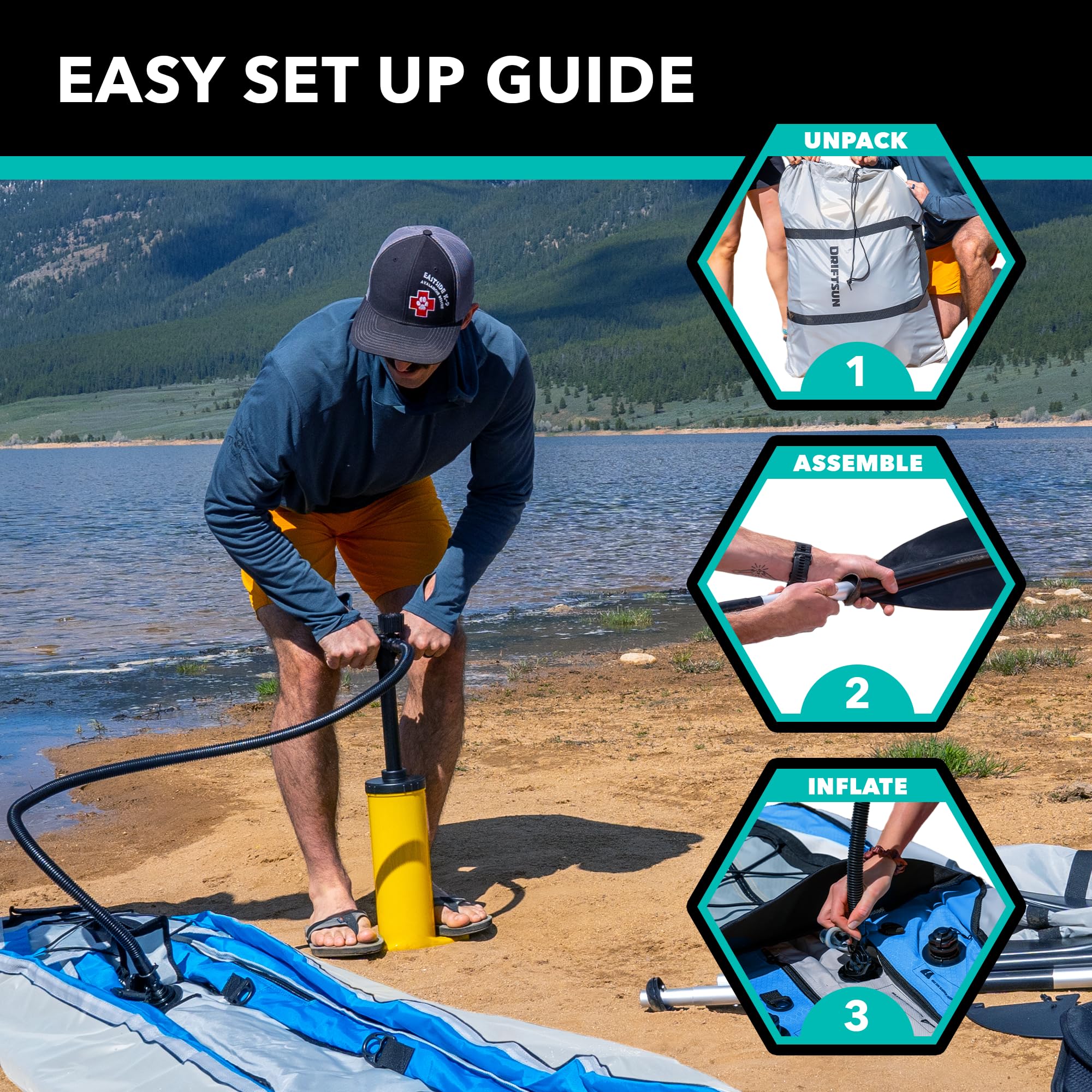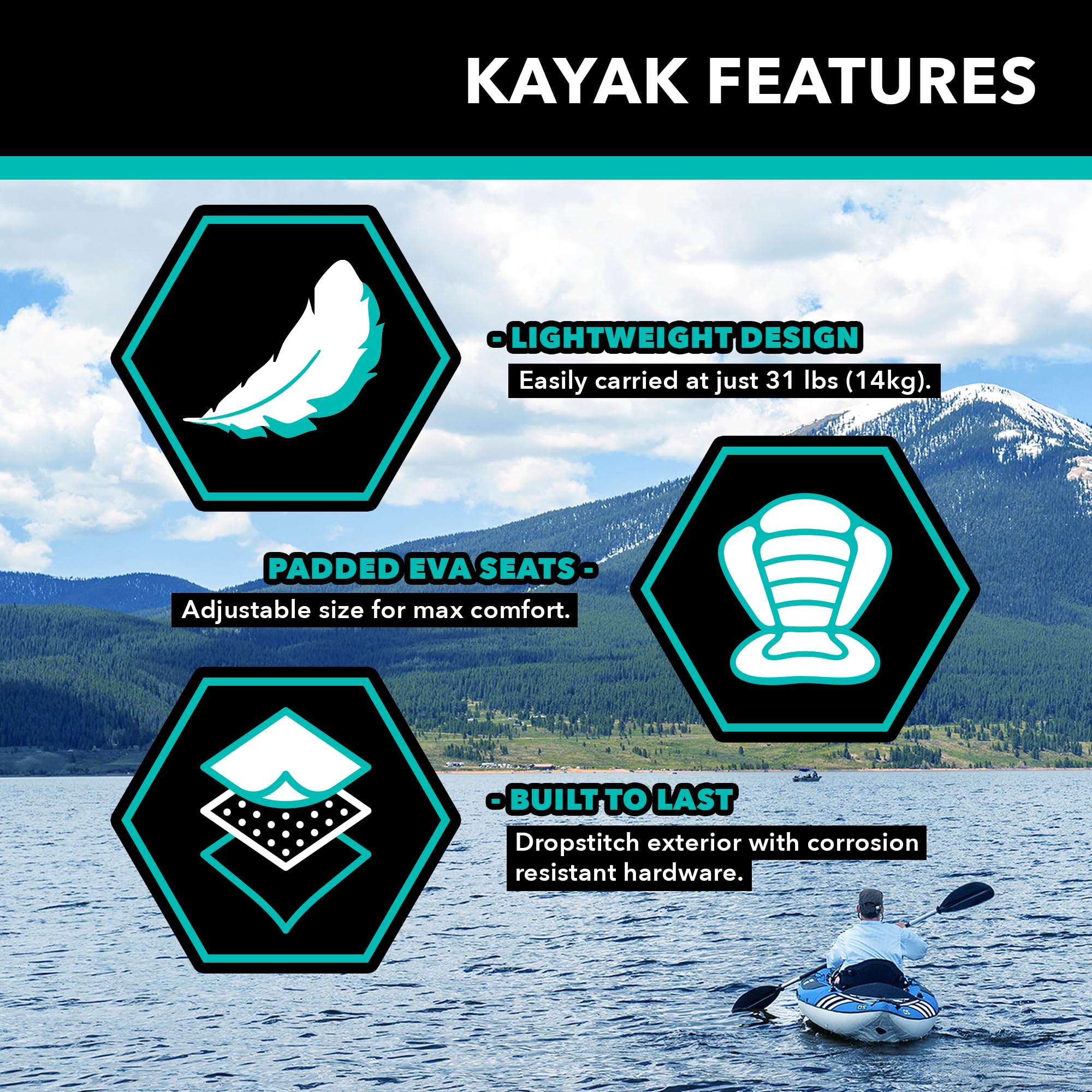 - PACKAGE INCLUDES – Inflatable Kayak, Adjustable EVA Padded Seat with High Back Support, Dual Blade Kayak Paddle, Deluxe Dual Action Pump, Quick-release fin, and a Travel Bag.