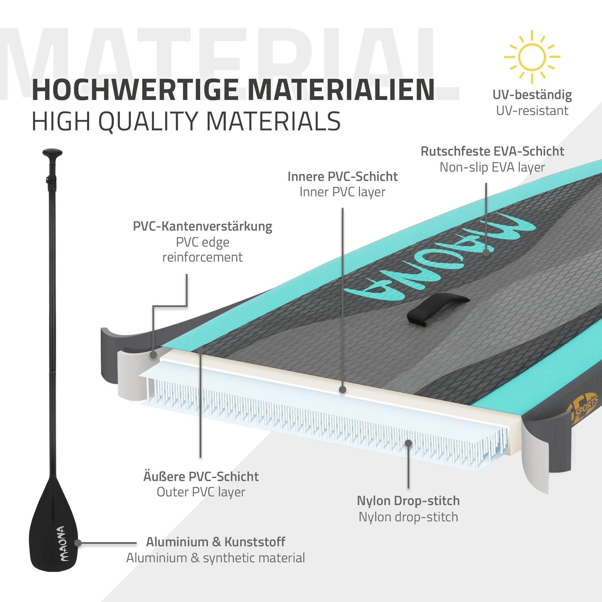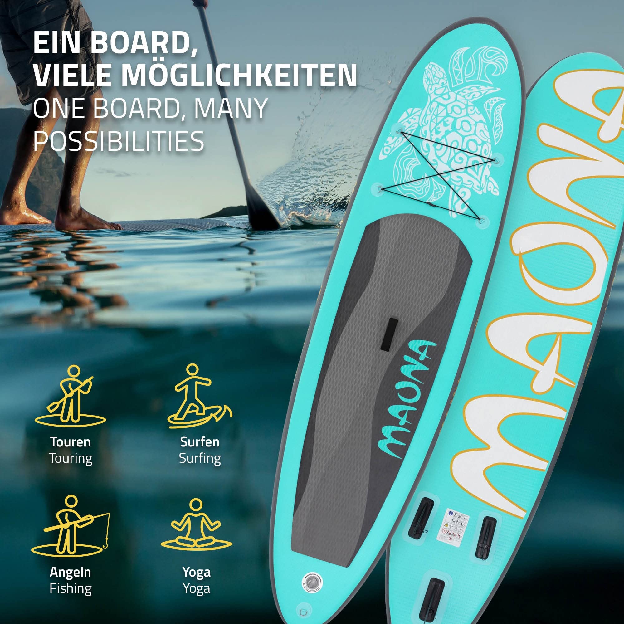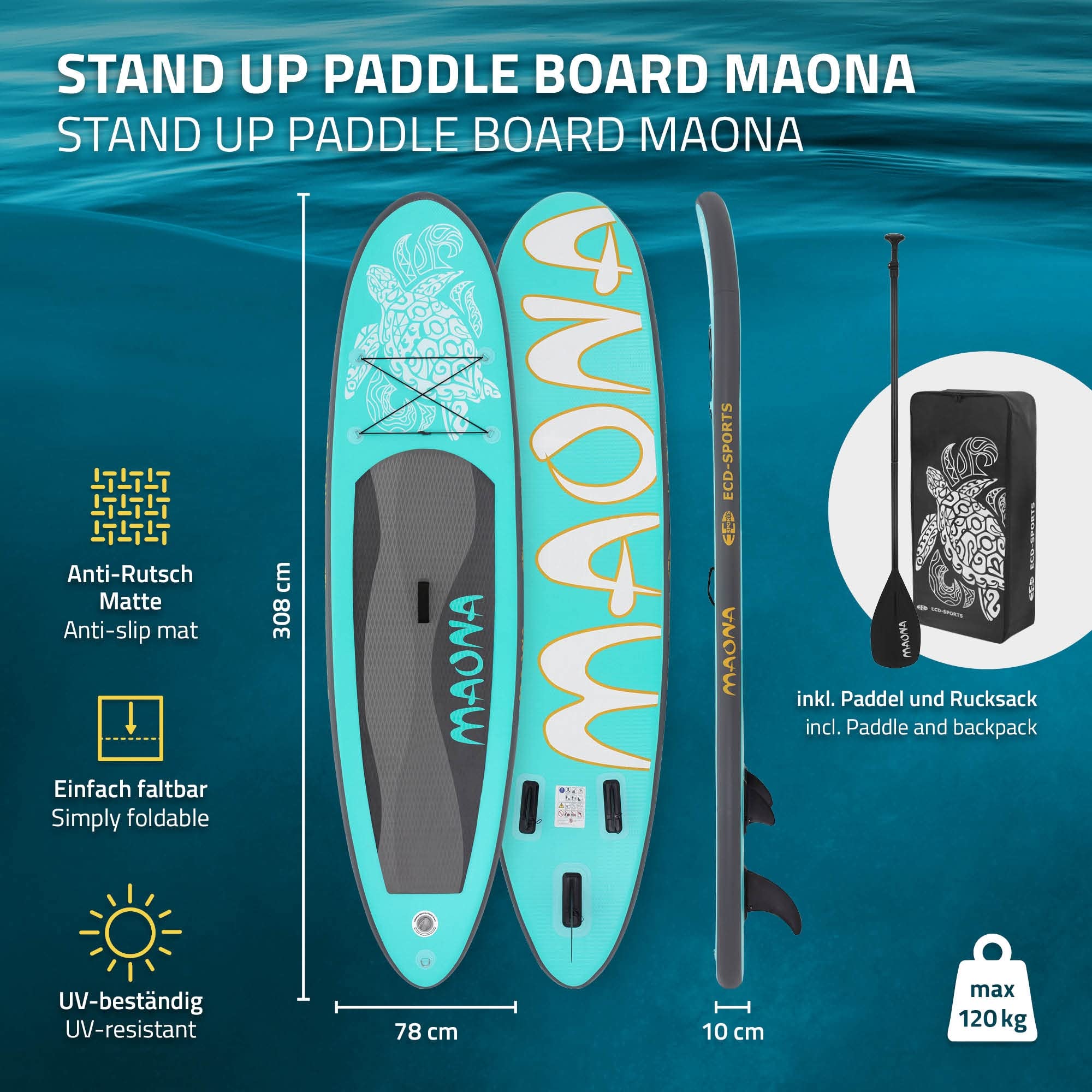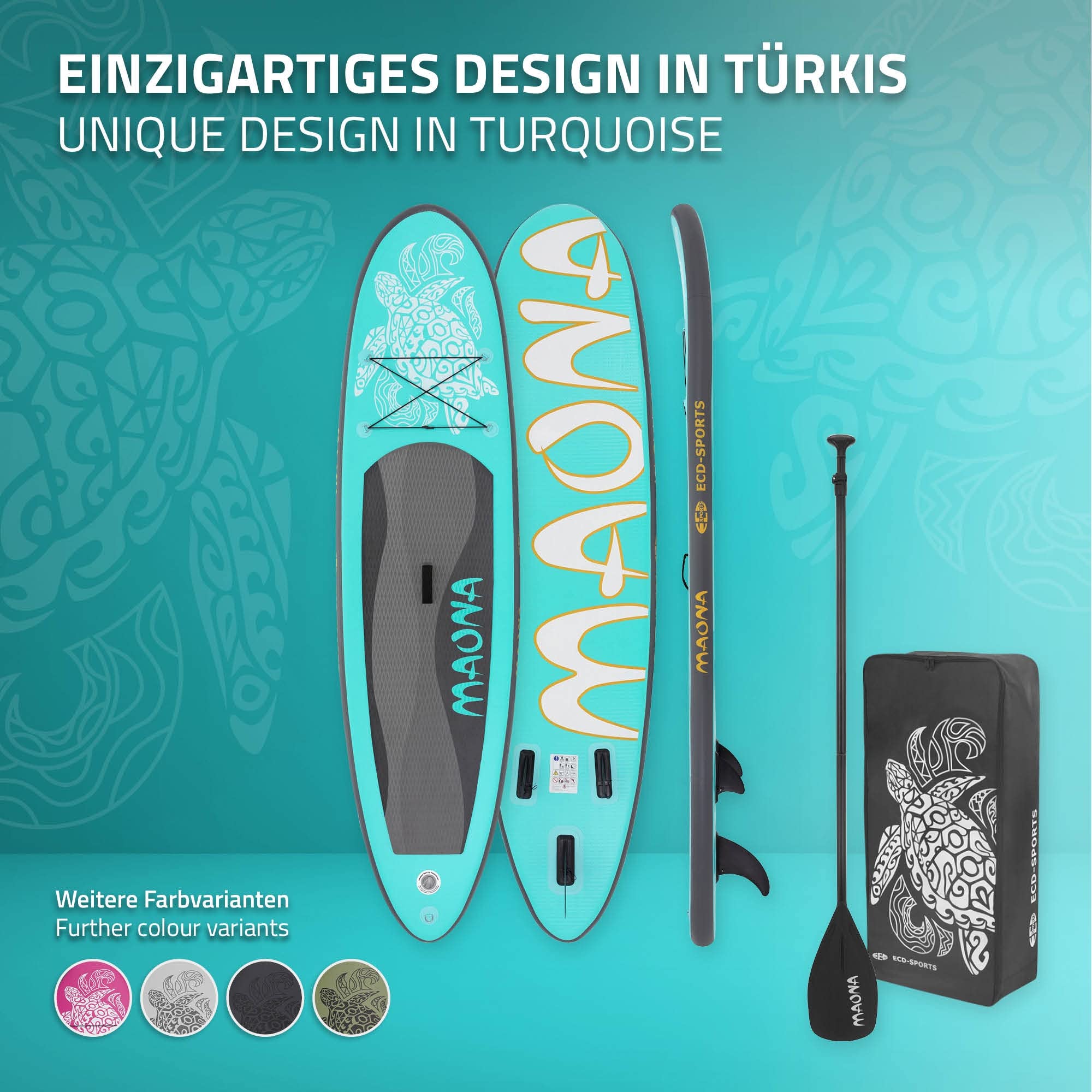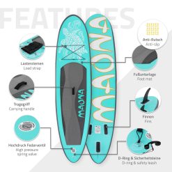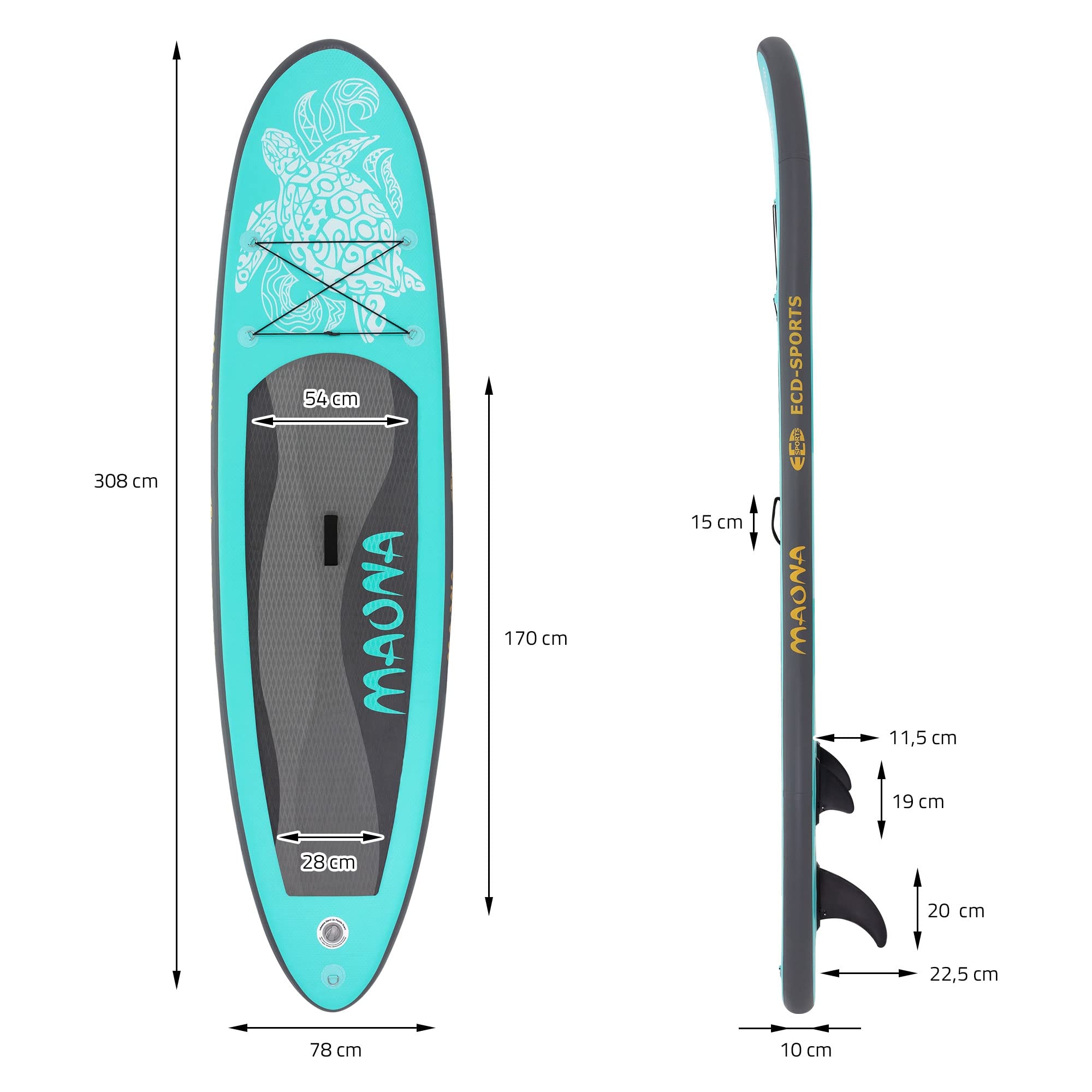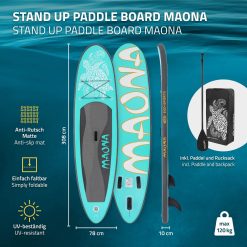 ECD Germany Tabla Hinchable Maona Paddle Surf/Sup 308 x 78 x 10 cm Turquesa Stand up Paddle Board PVC hasta 120kg 3 Aletas deslizantes Diferentes Modelos Incl Paleta Aluminio Bomba y Accesorios