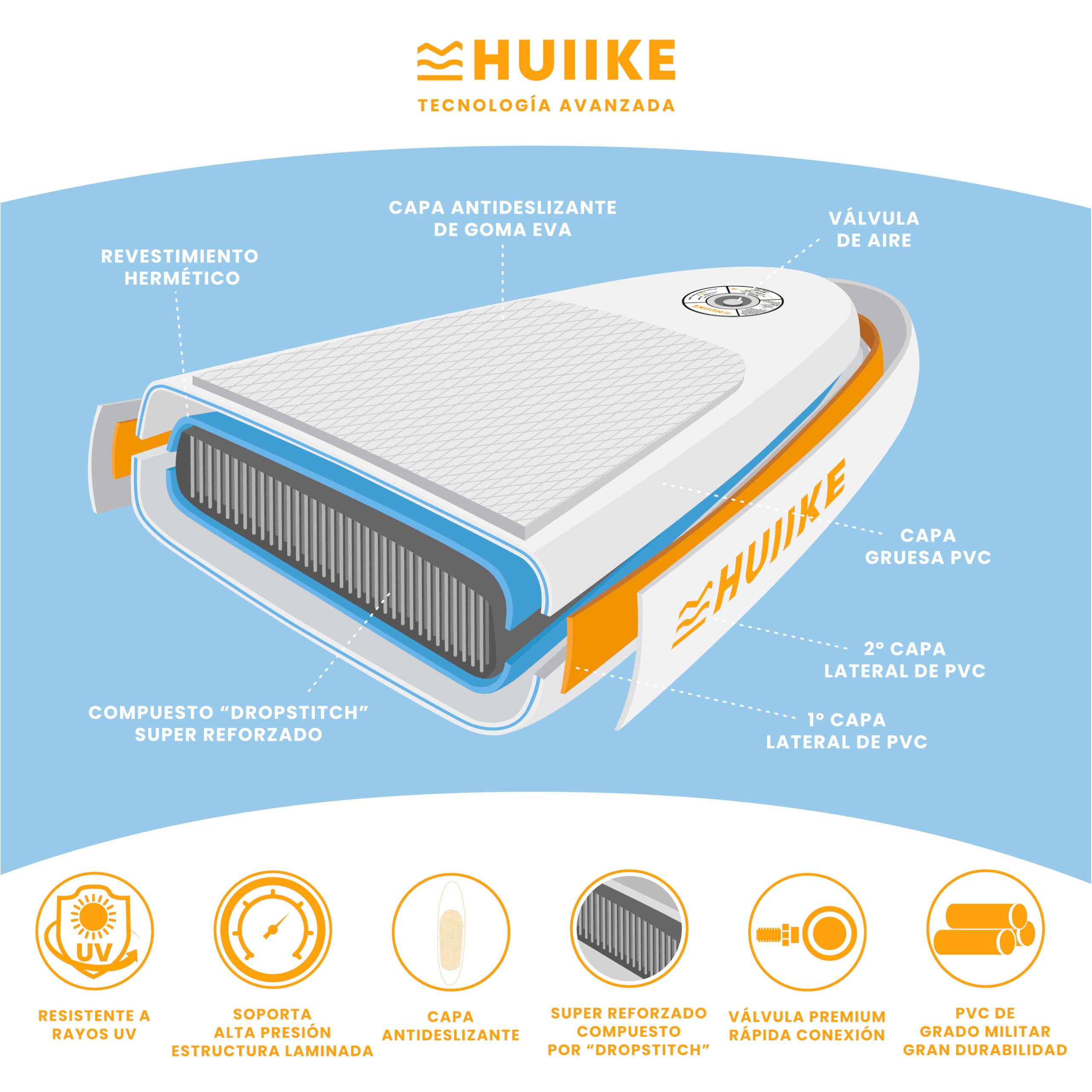 - Resistencia y Durabilidad – Tabla sup con revestimiento hermético PVC de grado militar y doble capa lateral para mayor protección y evitar fugas de aire. Con válvula de fácil uso y gran calidad