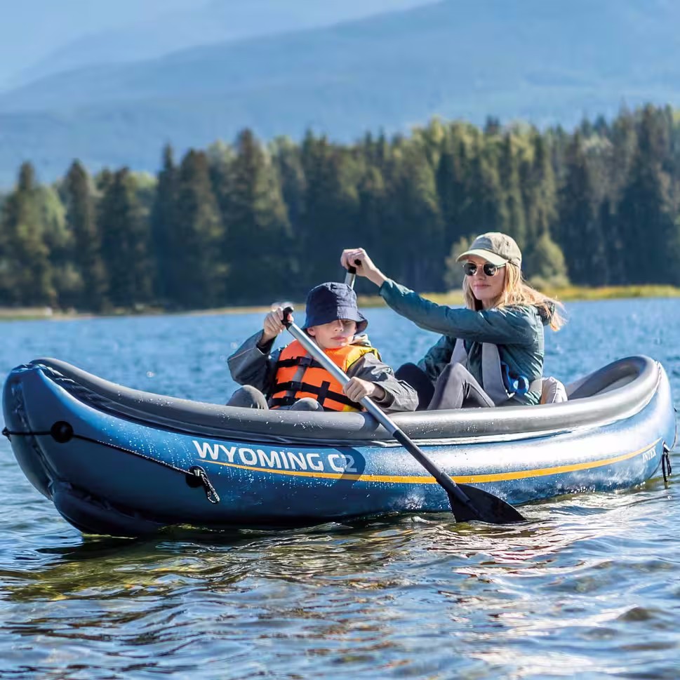 Canoa hinchable doble INTEX modelo Wyoming C2, perfecta para disfrutar cómoda y seguramente de largos paseos por lagos y ríos poco profundos en buena compañía