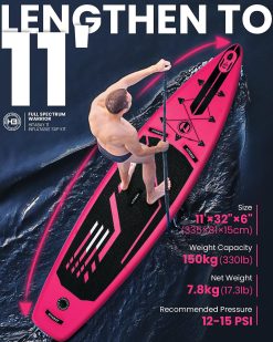 - 💗SUP ULTRA LIGERO | Inflado de 335 x 81 x 15cm, pesa SÓLO 7,8kgs, lo que lo hace fácil de transportar. La capacidad máxima es de hasta 150 kgs, estable y excelente para todos los niveles y condiciones. El SUP de 11’ está especialmente diseñado para la velocidad y brinda espacio adicional, lo que significa que puedes disfrutar de la maravillosa experiencia de remar con tu amigo, niño o mascota.
