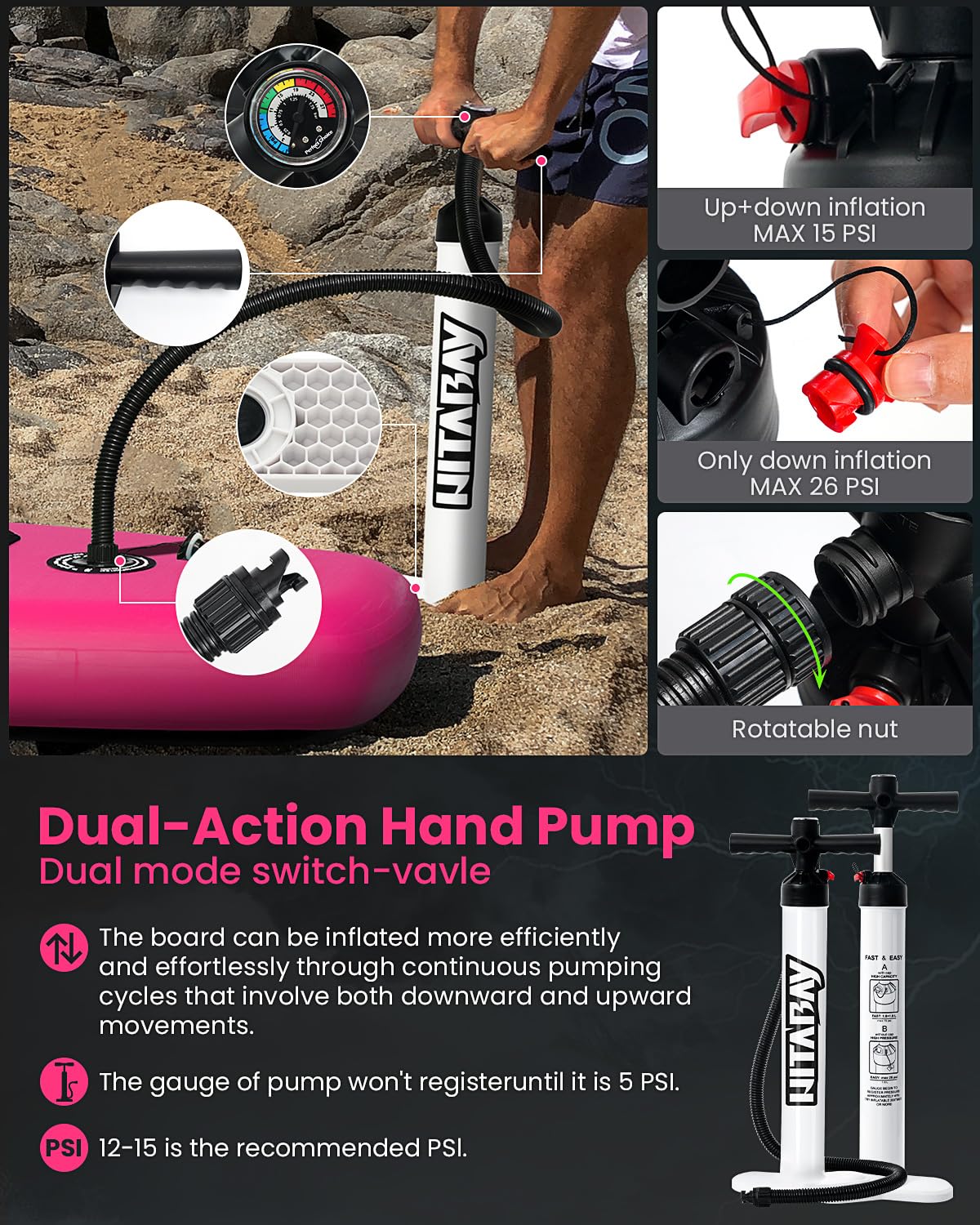 - 💗KIT COMPLETO DE PADEL SURF HINCHABLE | Viene con todo lo necesario para empezar a remar: correa de seguridad, bomba manual de doble acción, aleta extraíble, remo flotante de longitud regulable, mochila de viaje, kit de reparación, manual de instrucciones. Proporcionamos BOMBA MANO DE DOBLE ACCIÓN que puede inflarse y desinflarse rápidamente.