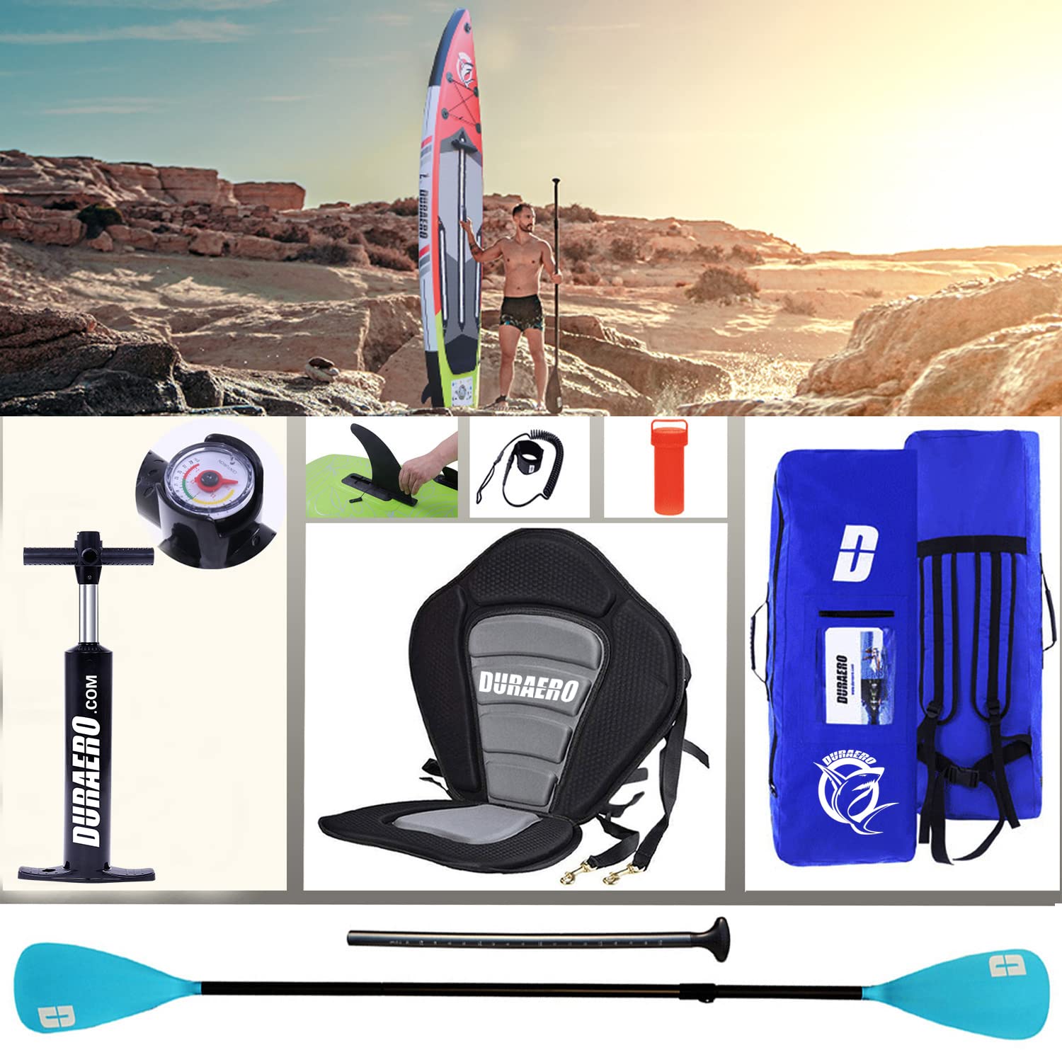 - ✅ Contenido del envío: 1 tabla de SUP, 3 aletas, asiento de kayak, correa de seguridad (correa), kit de reparación, bomba de aire, instrucciones completas (idioma español no garantizado), mochila portátil (85 x 25 x 30 cm), remo doble ajustable con indicador de longitud.